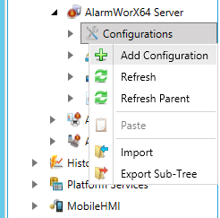 When you are creating a configuration for an Alarm Server database, you can use an existing configuration as its basis or starting point if such a configuration already exists. To do this, you use the Import and Export features that are available in AlarmWorX64 Server. (For instructions, refer to Exporting and Importing AlarmWorX64 Server Components.) Otherwise, you must create the configuration from scratch.