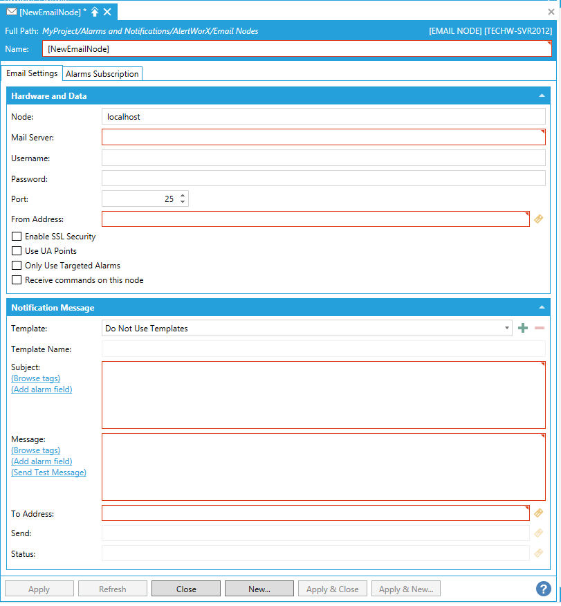 In the Hardware and Data sections, you can enter the Node name of the Alert Email Service in the text entry field. Next, enter the Mail Server to connect to. Provide the Username and Password for the mail server, as well as a Port number. In the From Address field, enter an email address recognized by the mail server. Click the Enable SSL Security checkbox if the mail server requires an SSL/TLS security connection. Click the Use UA Points checkbox when Notification Message Fields are loaded as data points. Click on Only Use Targeted Alarms if flagged alarms are to be used. Alarms are flagged by adding flags to alarms in the alarm server. If the Receive commands on this node checkbox is checked, this node will receive commands from the client.