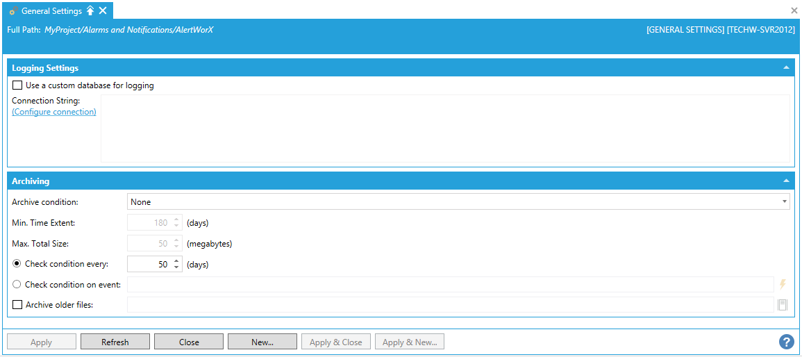You can set common properties (e.g. Logging and Archiving) within AlertWorX via its General Settings, which can be found upon expanding the AlertWorX node in the Project Explorer in the Workbench, as shown below.