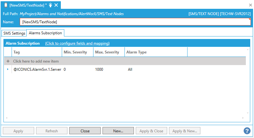 Start the Workbench, then expand your project. Next, expand the Alarms and Notifications node to show the AlertWorX node. Expand the AlertWorX node to show the Configurations node. Expand the Configurations node to show the SMS/Text node.