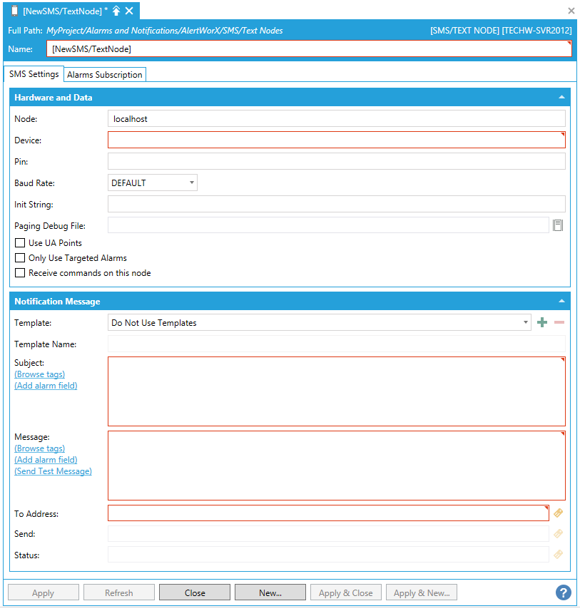 button to open the Data Browser and select a data source to populate the Status field.SMS/Text - Alarms Subscription Tab
