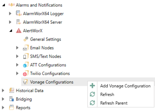 Go to Alarms and Notifications>AlertWorX>Vonage Configurations. Right-click and select Add Vonage Configuration, as shown below.