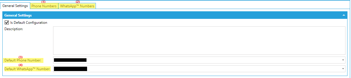 General Settings, Phone Numbers, and WhatsApp Numbers Tabs