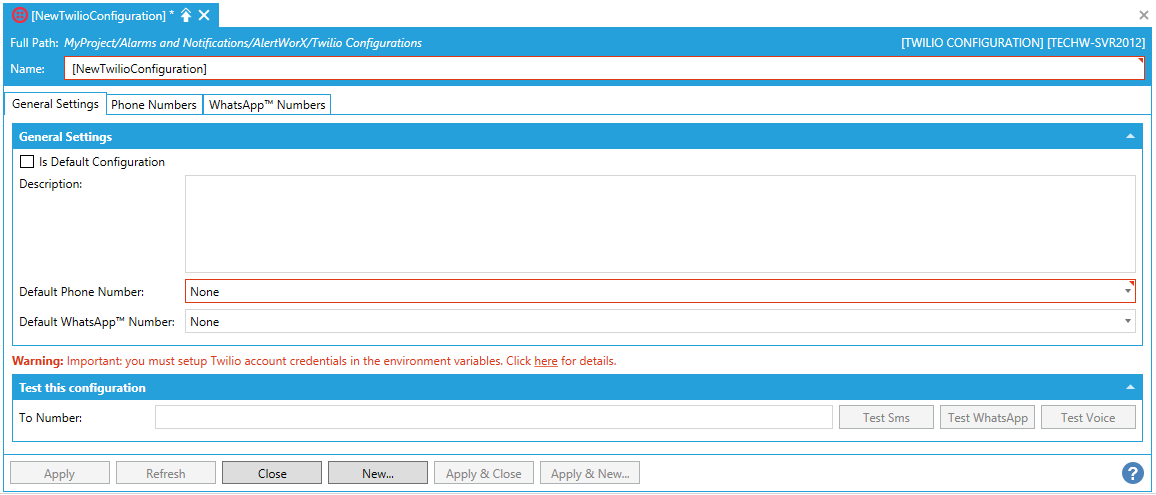 Start the Workbench, then expand your project. Next, expand the Alarms and Notifications node to show the AlertWorX node. Expand the AlertWorX node to show the Configurations node. Expand the Configurations node to show the Twilio Configurations node.