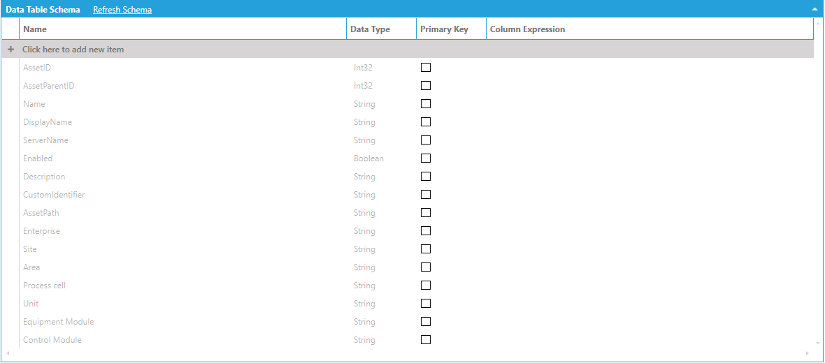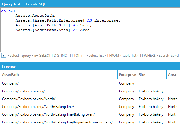The data schema lists the AssetPath column (which is our hierarchical column) and the individual levels (Enterprise, Site, Area, etc.). Individual levels can be accessed by name in the same way as DateTime levels.