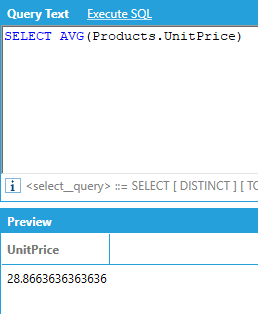 The GROUP BY keyword is not supported: results will automatically be grouped by all the attributes that do not have an a specified aggregate. For example, if we want to calculate the average unit price for all products in the Products table: