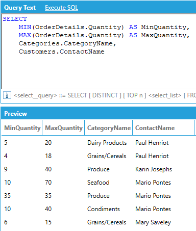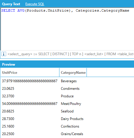 If we want to calculate the same average grouped by category name, we use the query below. The query automatically groups by CategoryName because it does not have an aggregate.