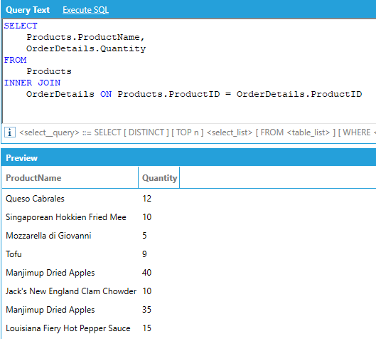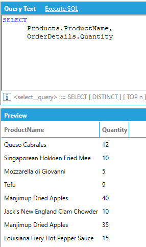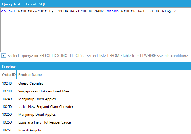 For example, if we want to show the order ID and the product name for all orders where the quantity ordered of the product was greater than or equal to 10: