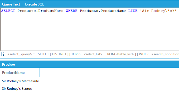 Literal single quotes and literal backslashes need to be escaped using backslash. The LIKE comparison operator uses the percent sign (%) as a wildcard, same as standard SQL. Also same as standard SQL, to match a literal percent sign, wrap it in square brackets ([%]):