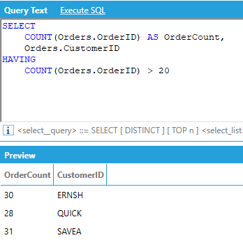 For example, let’s assume we want to return the number of orders per customer, but only for customers that have more than 20 orders: