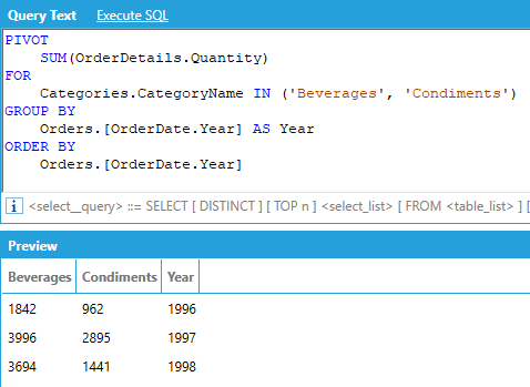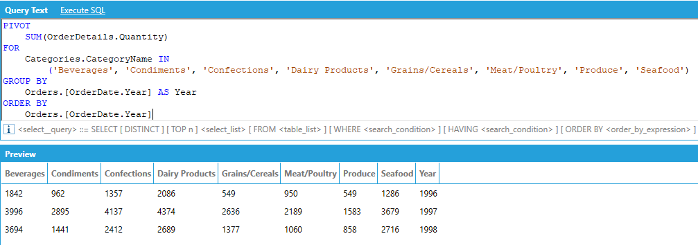 For example, assume that we want to display the total of the quantities ordered for each product category per calendar year, where the categories are columns in the output: