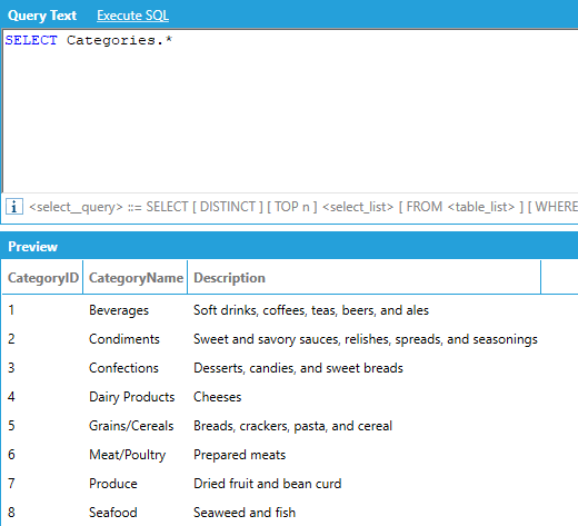 For example, we can return the name of all products for which the Category ID is 8 (Seafood):