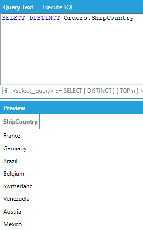 AnalytiX-BI supports the DISTINCT keyword to only return distinct rows from a query: