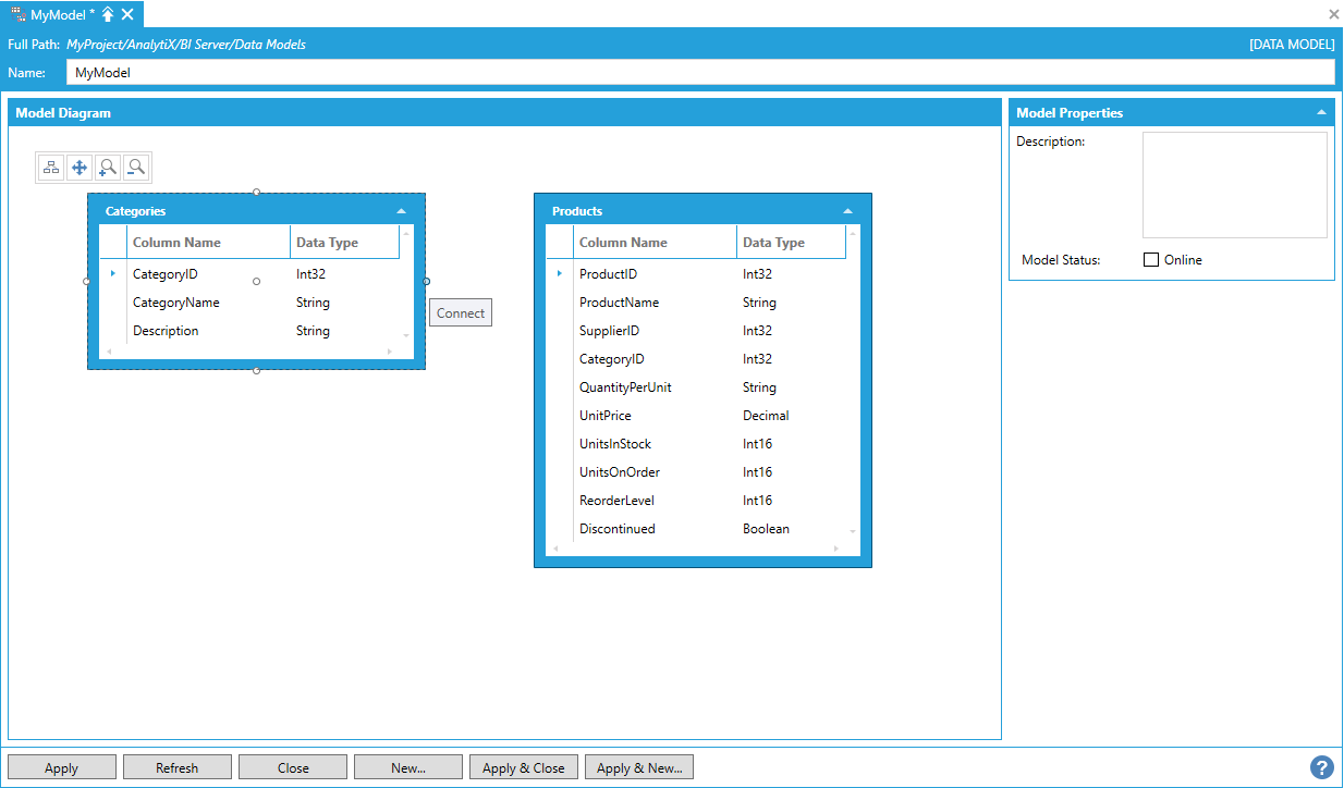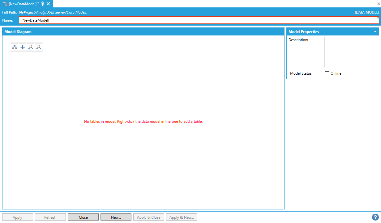 Newly created data models are offline by default. Offline data models are not loaded by the AnalytiX-BI Server runtime and are not available to clients.