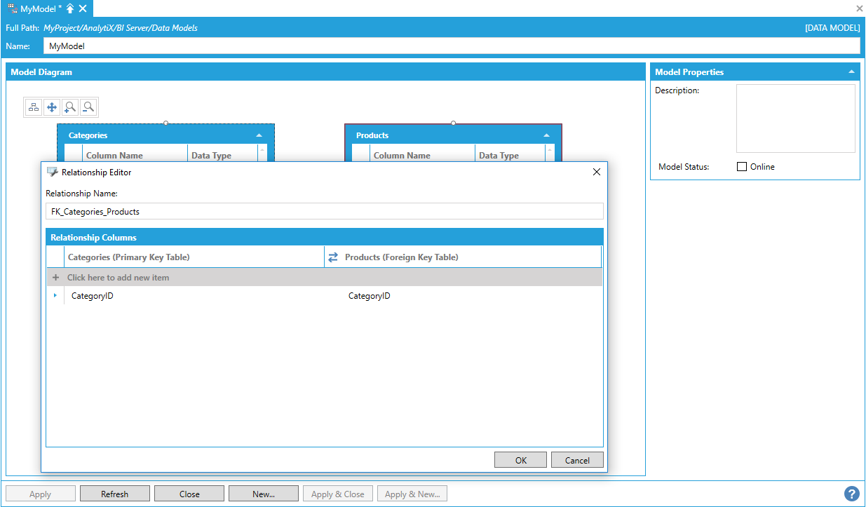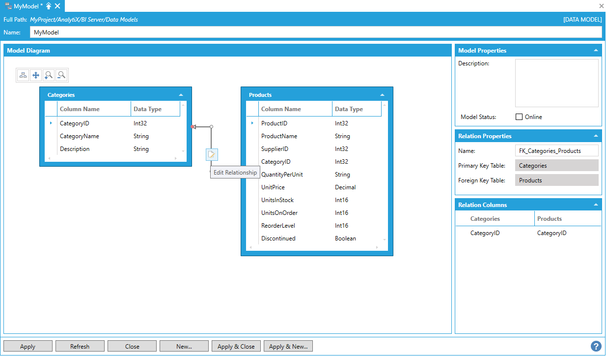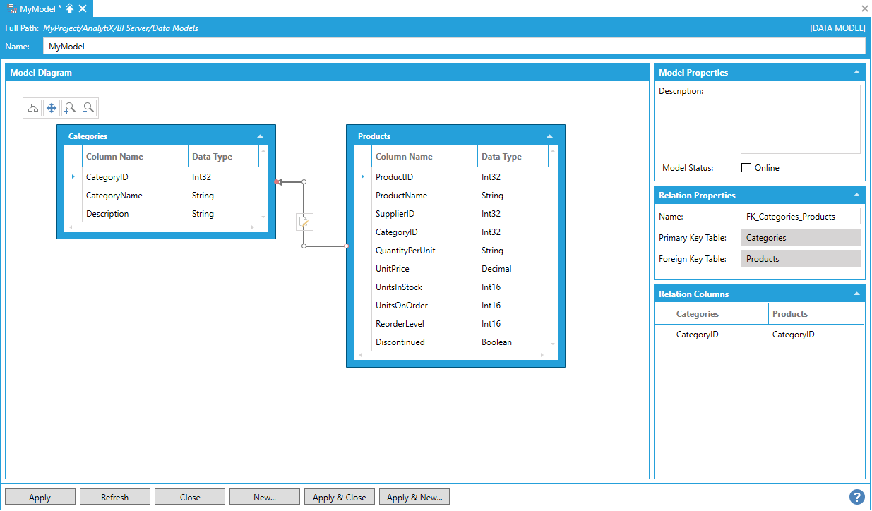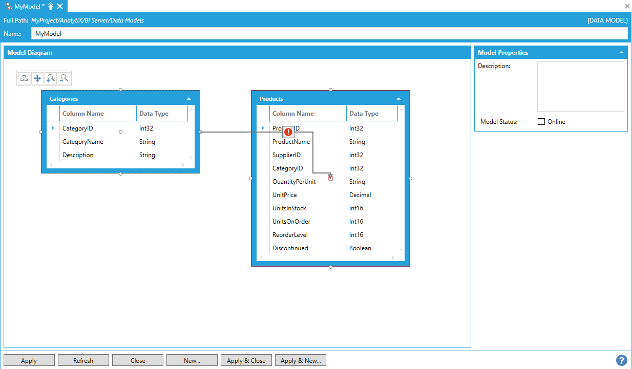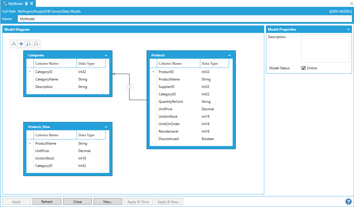Note: It was not possible to create relationships between Data Views and Data Tables in previous versions and, for this reason, Data Views were not displayed in the Model Diagram panel. If you have a Data Model that was upgraded from a previous version of AnalytiX-BI, you will need to manually upgrade your Data Views if you want them to show up in the Model Diagram panel. To upgrade a Data View, just open the related configuration form and make any change that will trigger the form to apply the changes (it can be as simple as adding and then removing a character from the Data View’s name). Once the Data View has been saved, refreshing the Data Model configuration form will bring the Data View in the Model Diagram panel.