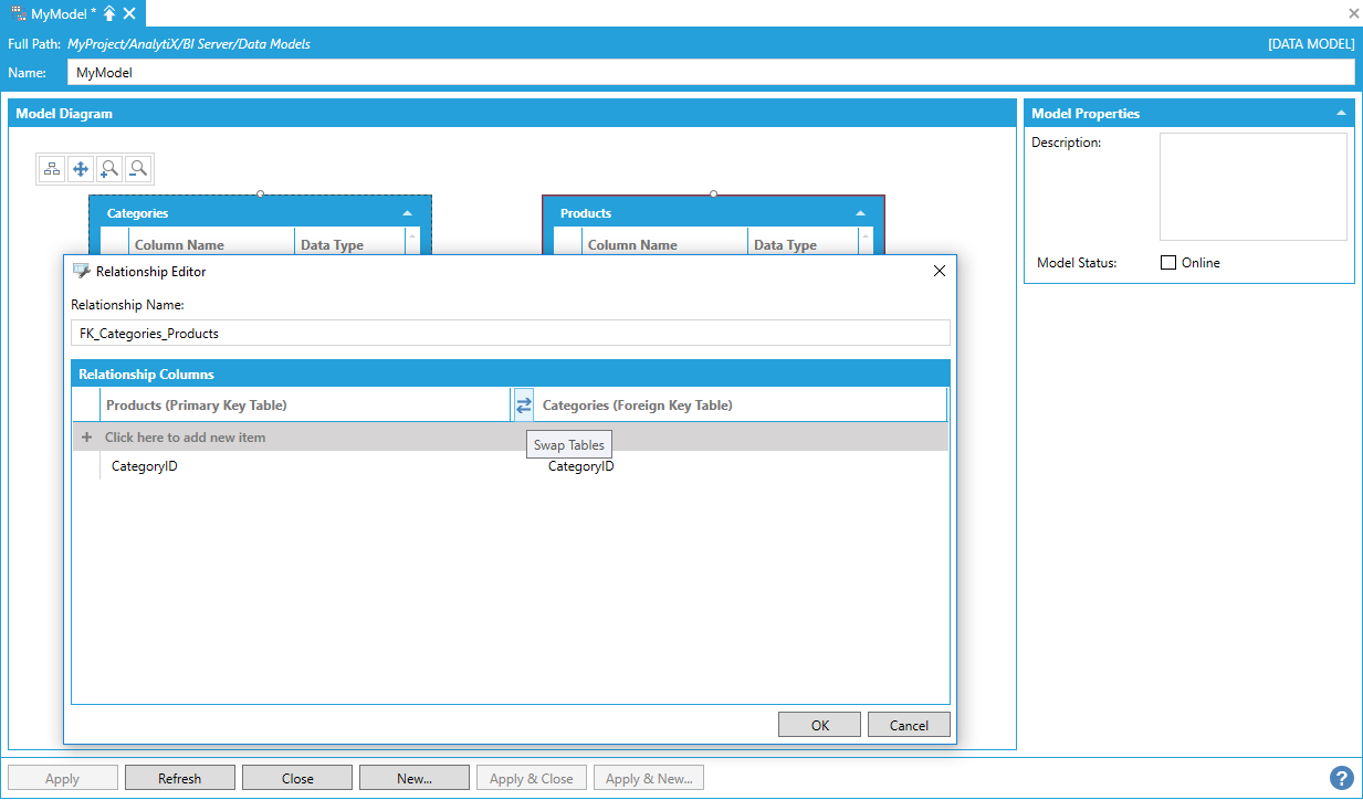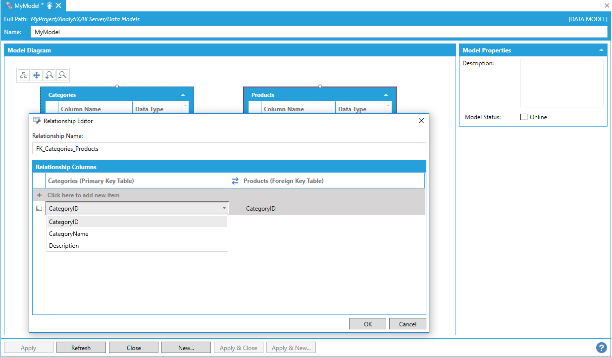 In the example above, the Categories table has a primary key defined on the CategoryID column, and the Products table has a non-primary key column also called CategoryID with the same data type. For this reason, AnalytiX-BI automatically infers that Categories is the primary key table and Products is the foreign key table.