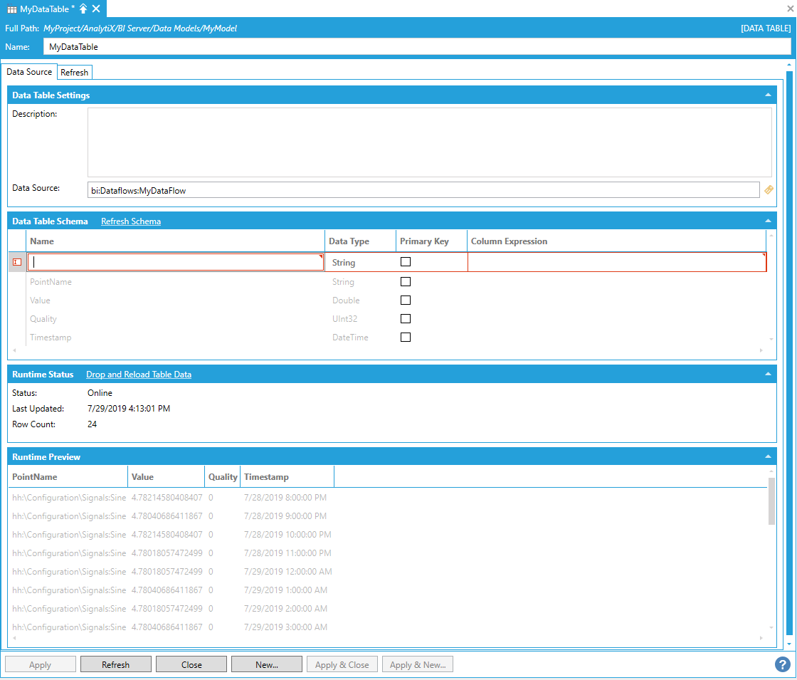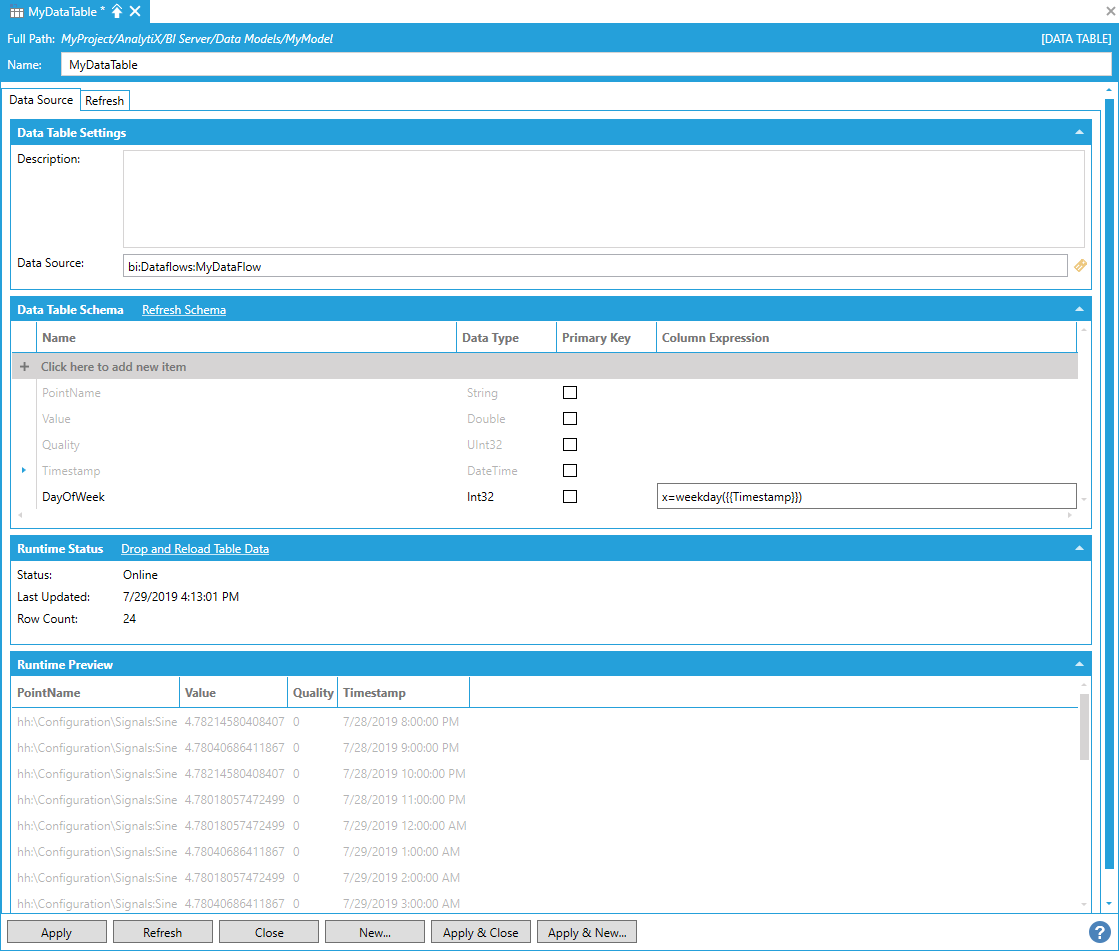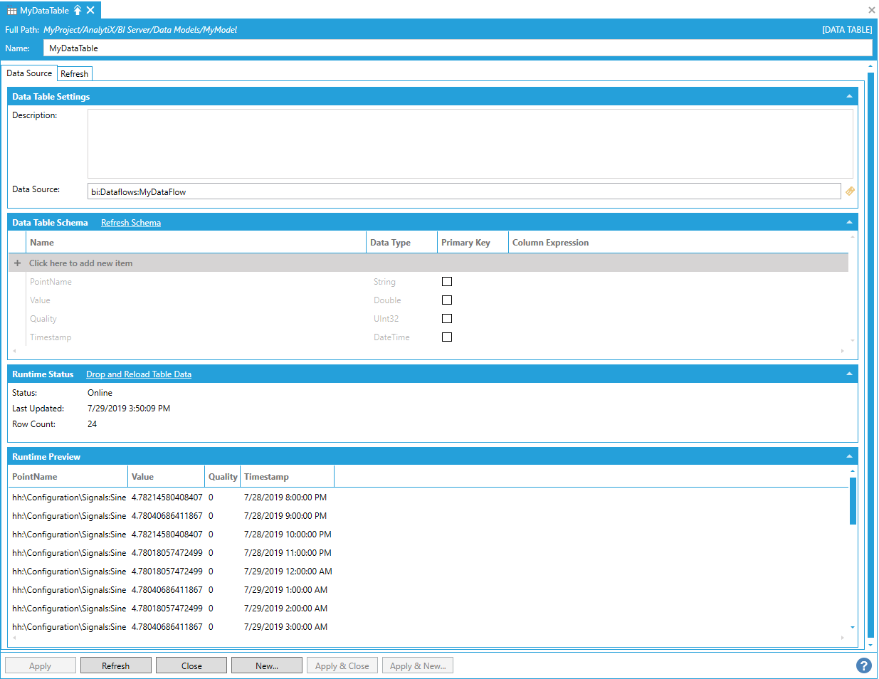 The points under Runtime Status will briefly show a bad quality value while the AnalytiX-BI Server runtime creates the Data Table and starts loading the data, and then they will update to reflect the current table’s status. In this example we are loading the table with data coming from a data flow ingesting Hyper Historian aggregated data. The aggregate is calculating the interpolated value of some historical tags at 1-hour intervals over a 1-day span.