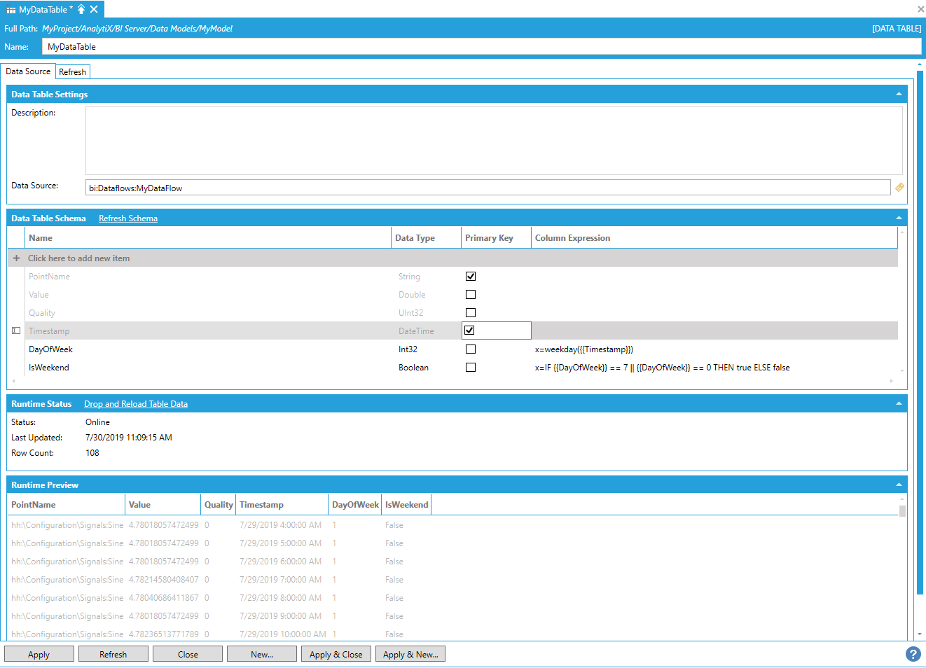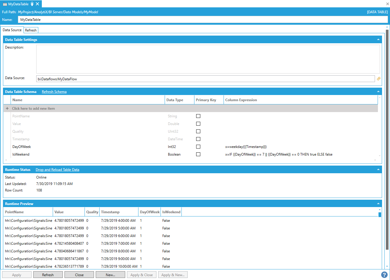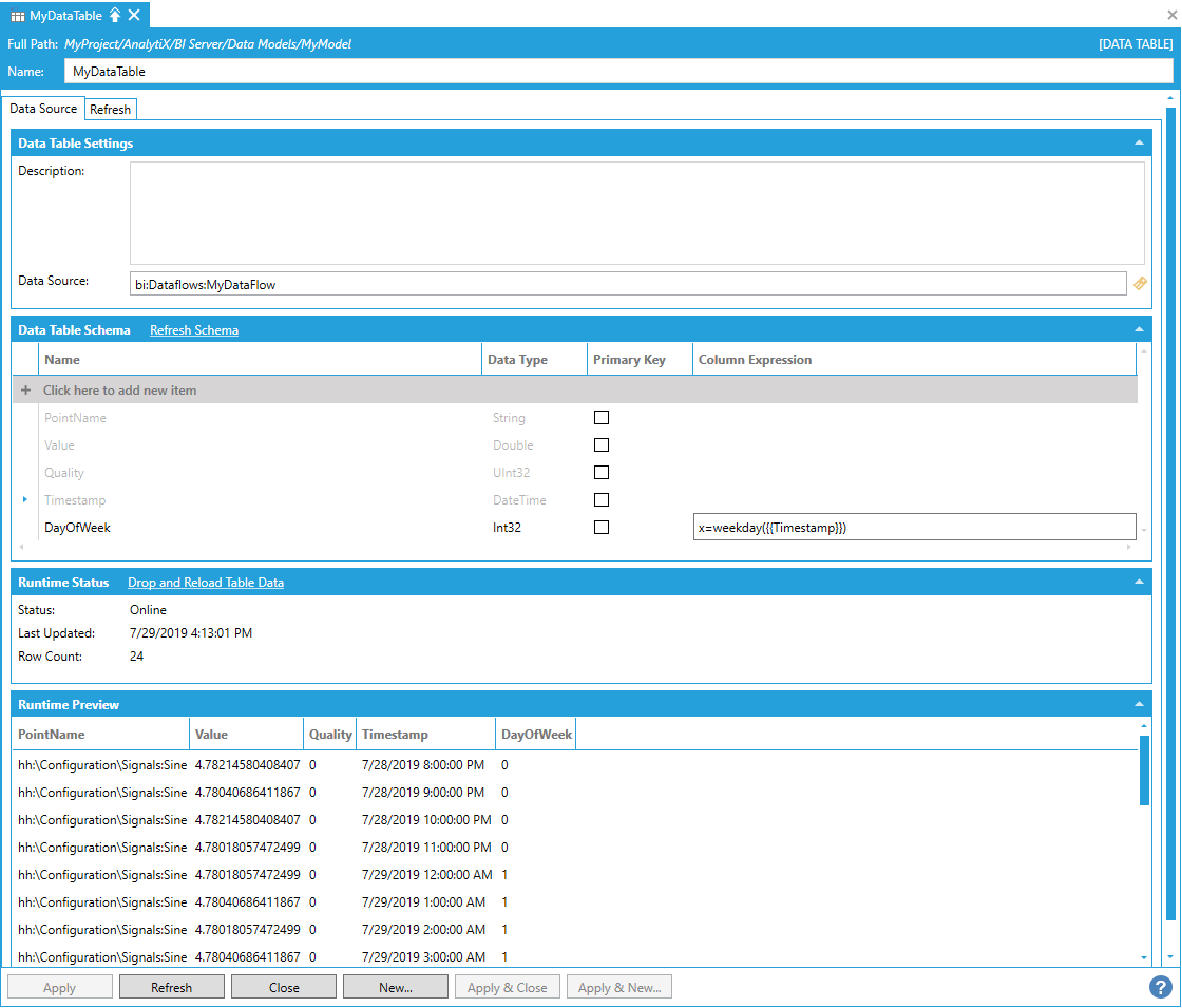 The points under Runtime Status will briefly show a bad quality value while the AnalytiX-BI Server runtime creates the Data Table and starts loading the data, and then they will update to reflect the current table’s status. In this example we are loading the table with data coming from a data flow ingesting Hyper Historian aggregated data. The aggregate is calculating the interpolated value of some historical tags at 1-hour intervals over a 1-day span.