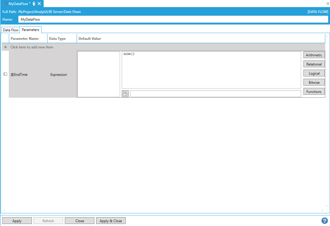 For example, assume that we changed our source data flow to use a StartTime and an EndTime parameter. We can configure the EndTime parameter using the now() expression which will always evaluate to the current date and time.