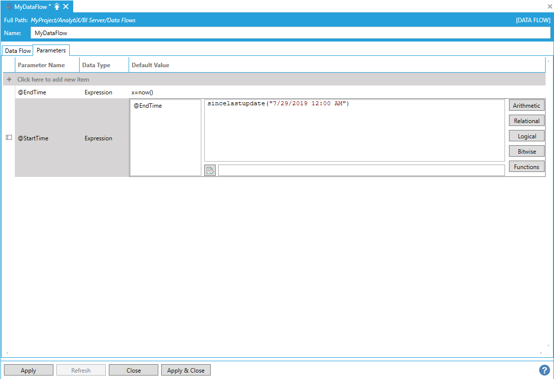 For the StartTime parameter we can pick the AnalytiX-BI built-in sincelastupdate function.