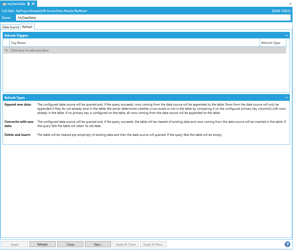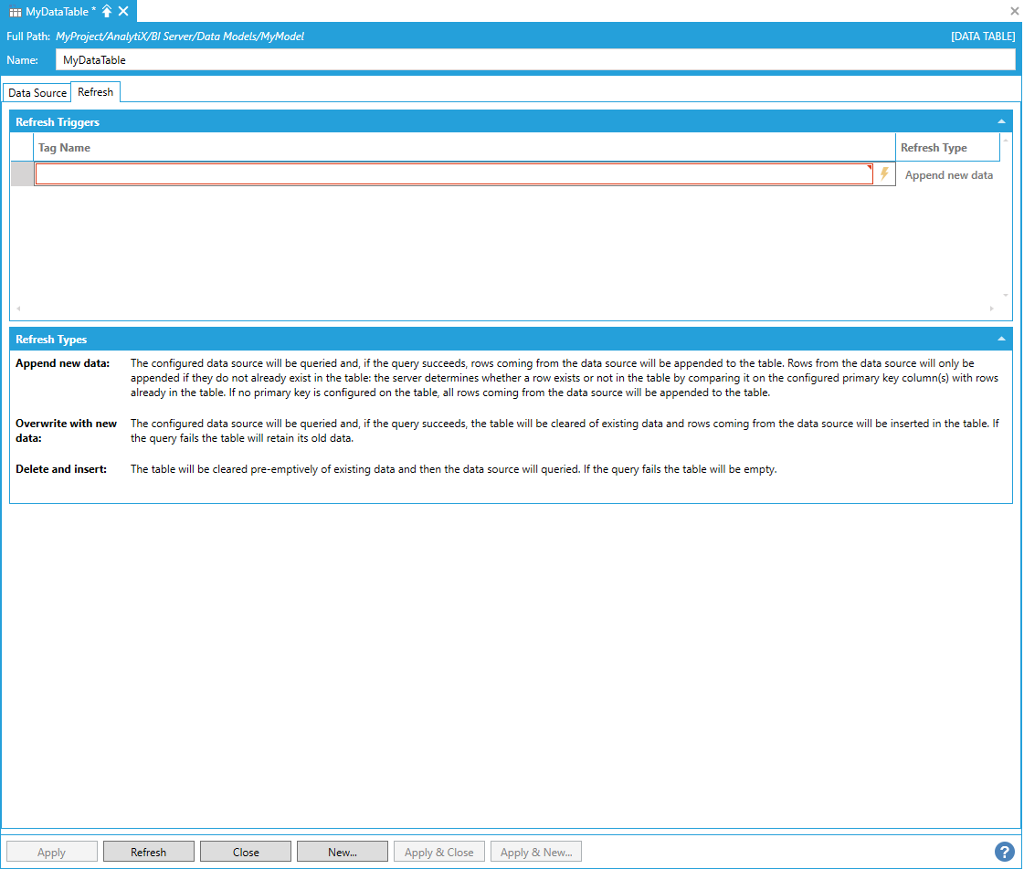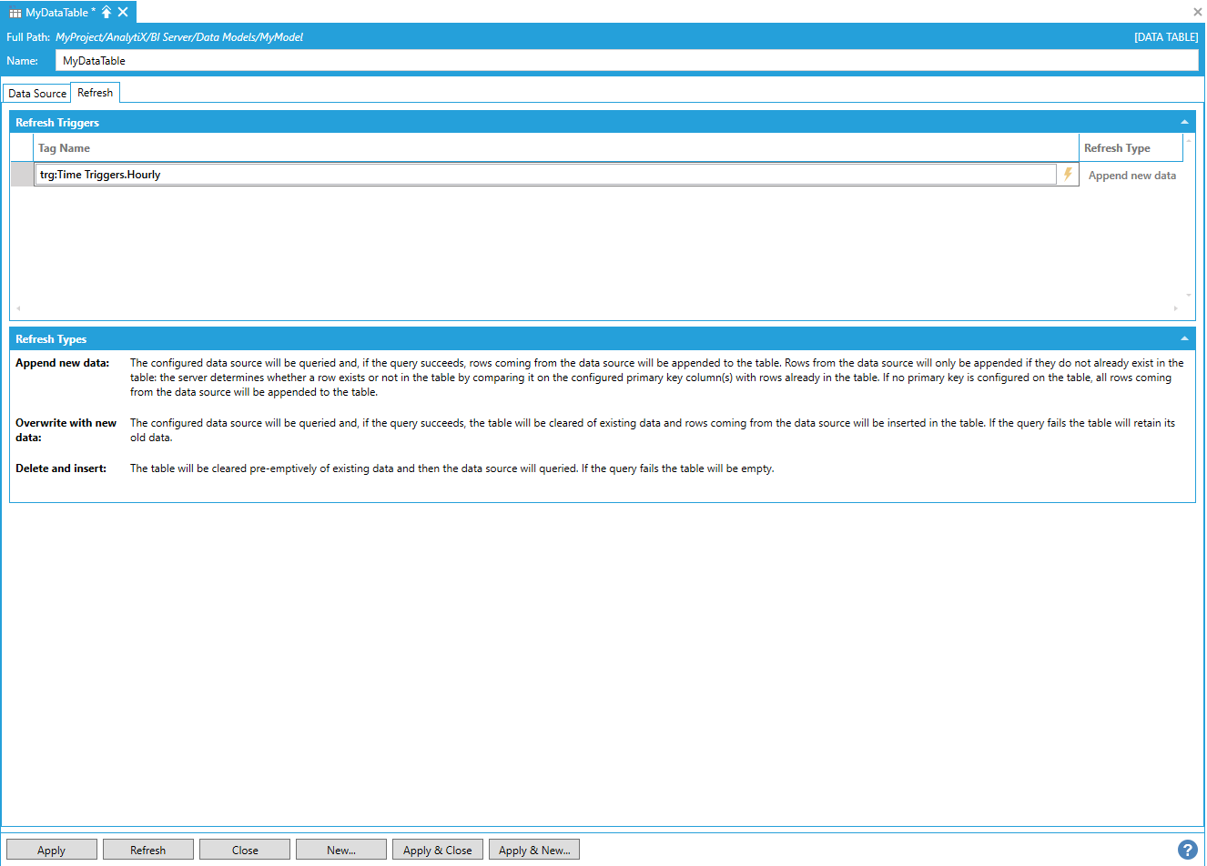 Append new data. When the trigger fires, AnalytiX-BI runtime will re-query the underlying data source, but it will retain all the data currently in the in-memory table. New rows coming from the data source will be scanned and compared to rows already in memory by the primary key column(s) that have been defined for the table: if the new row coming from the source already exists in the table based on the configured primary key it will be discarded, otherwise it will be appended to the in-memory table. This is useful in cases where the underlying data source provides new data, but the old data is still valid (for example a historical data source that returns new samples stored since the last time it was queried).