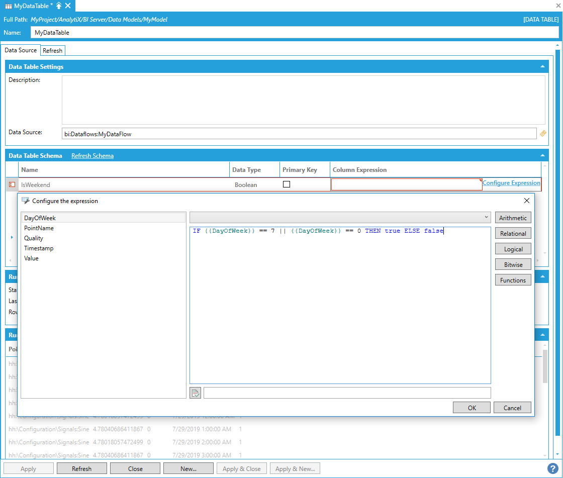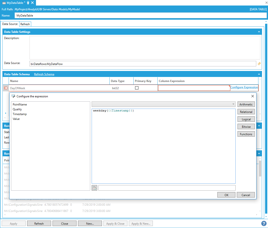 In a similar fashion to calculated columns in data flows, all the current columns in the table are available as variables for the expression. In the example above, we are using an expression to extract the day of the week from the Timestamp column.