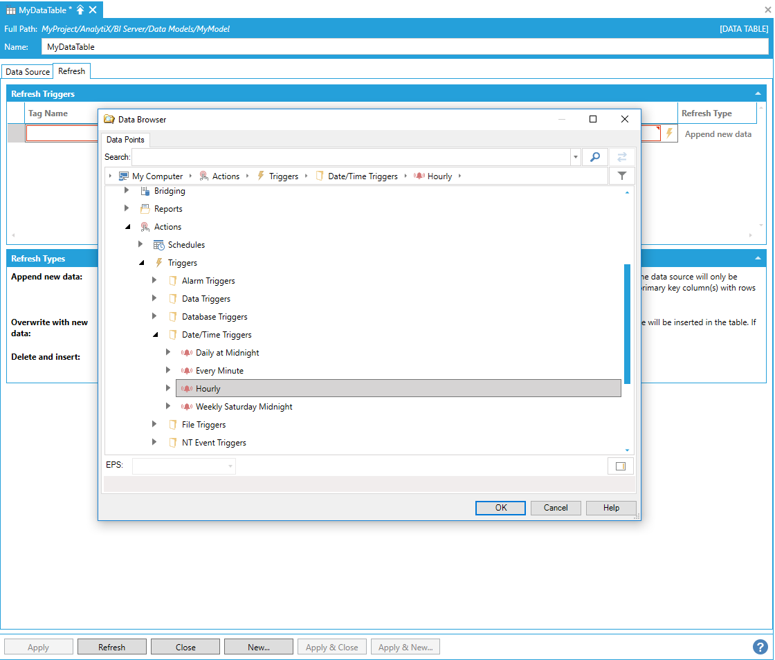 Any kind of trigger configured within the ICONICS system can be used. Once a selection is made, it is also possible to configure how data in the data table will be refreshed from the list under Refresh Type.