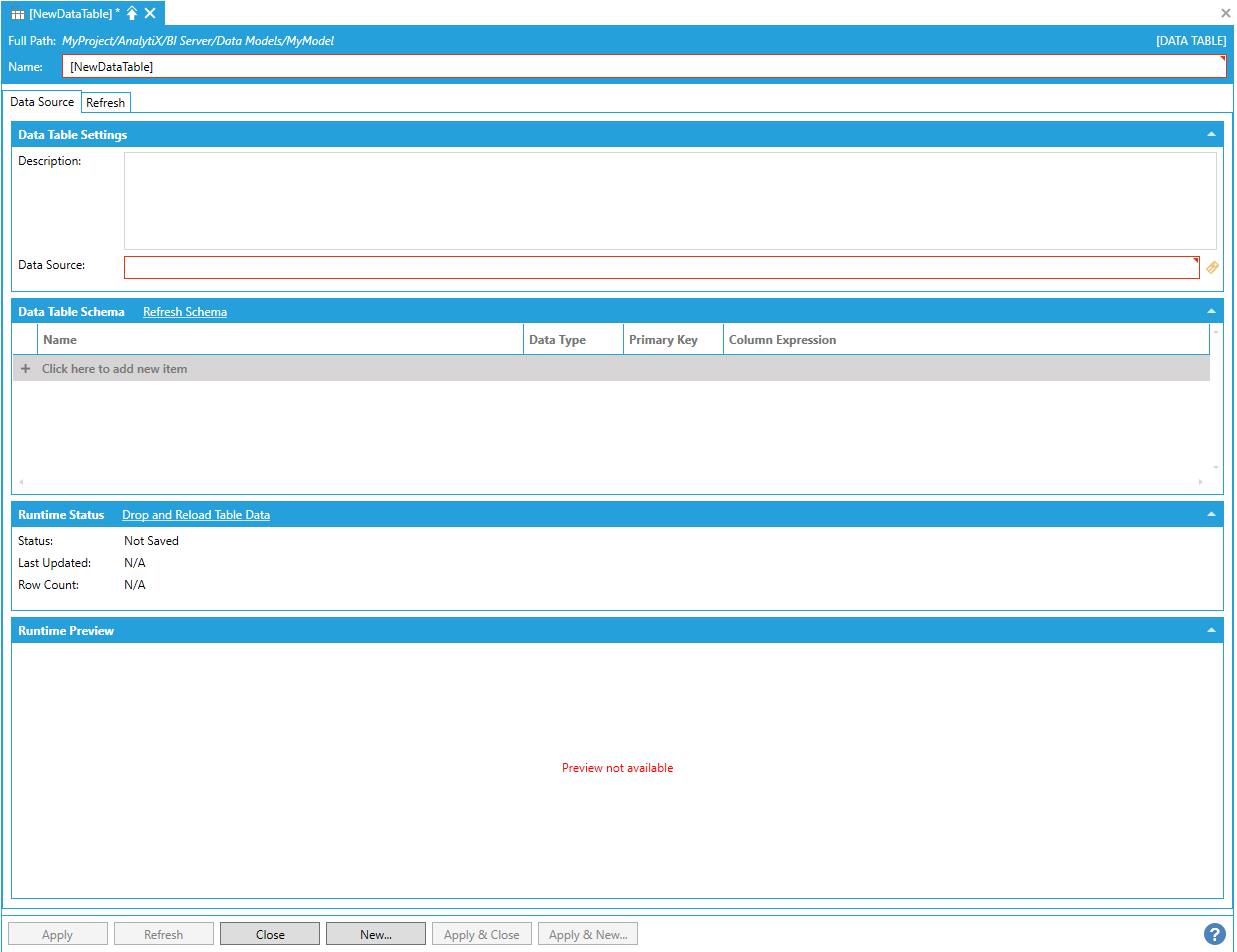 Note: Even though the Data Table Schema has been loaded by the form, no preview data is currently available and the runtime status of the Data Table shows “Not Saved” for the current table. This happens because the Data Table has just been created and has not been saved yet, which means that the AnalytiX-BI Server runtime is not yet aware of this new entity.