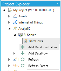 Open the Workbench and expand the AnalytiX node and then the BI Server Node. Select the Data Flows node, then select Add Data Flow Folder, as shown below.