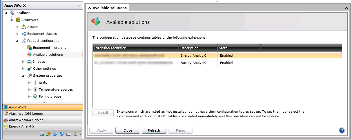 In the AssetWorX, the Product Configuration node is where you set your system settings. In the Project Explorer under localhost > [the name of your AssetWorX database. In our examples, we've named it 'AssetWorX'] > Product Configuration, select Available Solutions. This displays the Available Solutions tab which shows you ICONICS solutions that are installed or are available to be installed. On this tab you can see the extension IDs of each solution's configuration database files. You can also select a solution and click the Install button to create database tables and begin working with the solution.