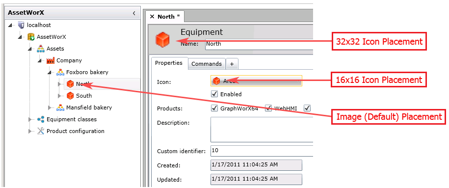 You can configure up to three versions of an icon image for use in AssetWorX. You must provide a default image file, which appears in the asset tree. You can also optionally provide a 16-pixel by 16-pixel version of the icon that appears in drop-down lists where users choose an icon, and a 32-pixel by 32-pixel version of the icon that appears in heading area of the Equipment tab. If you don't provide the two latter versions, the default version is used instead, as in the illustration below.