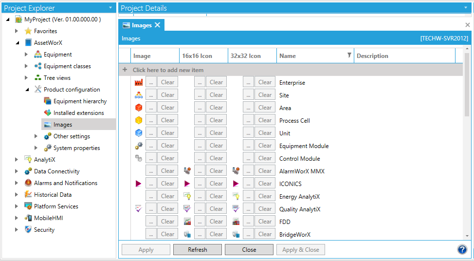 In the Workbench Project Explorer, expand your project, then the AssetWorX node, then the Product configuration node and then click on Images. This displays the Images tab (shown below), which displays the icons that are available for use in tiers of the equipment hierarchy. On this tab, you can add and remove icons that appear in the AssetWorX's asset tree. Steps for using this tab are provided in the Configuring icons for the equipment hierarchy topic. Icon images must be saved in .jpg or .png format. Once you have configured an image, you can go to the Equipment Hierarchy node and put it to use in a tier of the hierarchy.