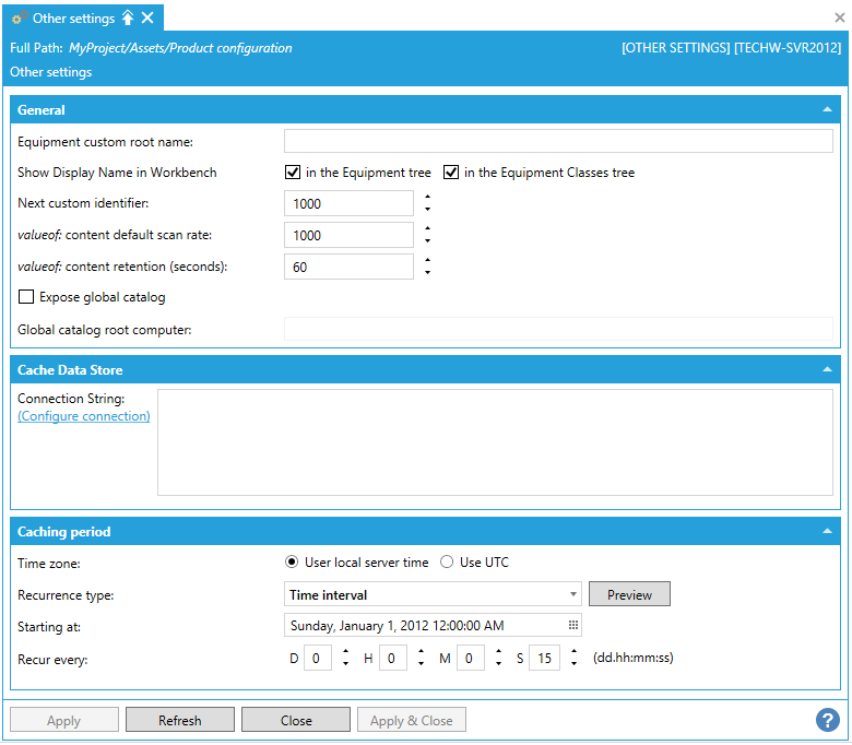 Connection String - The Cache Data Store section of the Other settings allows you to set a data storage location. Clicking on the Configure connection link opens the following window: