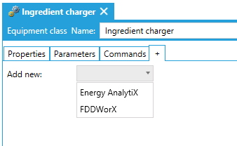 To open the + sub-tab, in the Workbench, in the Project Explorer, expand your project folder and the AssetWorX provider node and then the Equipment classes node. You can create a new equipment class or navigate to the existing equipment class that you want to add a provider tab for, and double-click it (or select it then click on the Edit button in the Edit section of the Home ribbon in the Workbench). This displays the Equipment Class properties, with the Properties tab opened by default. Click on the + tab to add either Energy AnalytiX or FDDWorX-related properties.