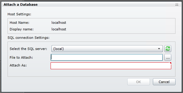 This will bring up the Attach a Database window. You have the option of selecting the SQL Server via a pulldown menu and then the File to Attach and the name to use for the database.
