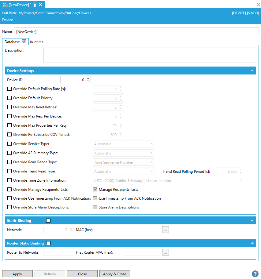 Static Binding – Clicking this checkbox prevents the device entry from being updated (recompiled) independently of this application. This is currently necessary for two-way communication with MS/TP slaves and certain other devices. Once the box is checked off, you can enter the Network and MAC ID numbers.