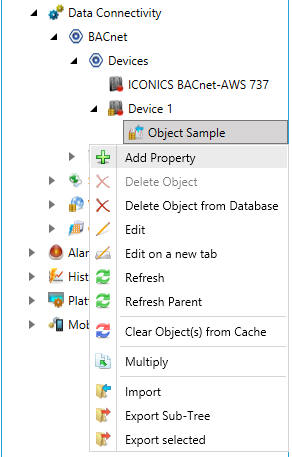 Expand the BACnet node, then the Devices branch to show any connected Objects. Next, select the Object to which you would like to add an Property, then and click on Add Property, as shown below.