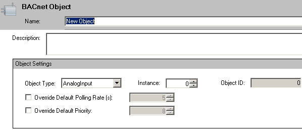 4. Specify the object Type in the Object Type drop-down menu (AnalogInput by default) and specify the right Instance # (usually 1). Object ID should be generated automatically.