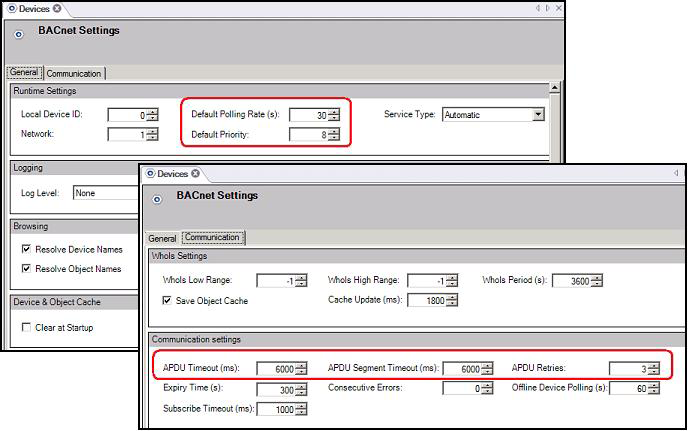 4. Enter the settings for: APDU Timeout, APDU Segment Timeout, and APDU Retries in the ‘Communication’ tab and Default Polling Rate and Default Priority in the ‘General tab’.
