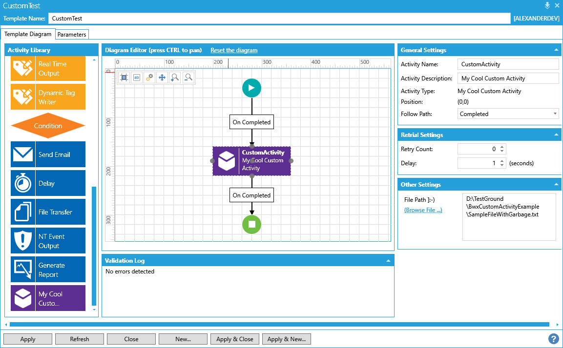 Now, restart IcoBwxService and the Workbench. You should now be able to see your custom activity in the Diagram Editor and BridgeWorX64 runtime will be able to run it.