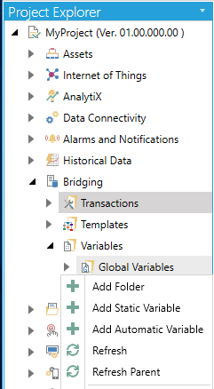 Open the Workbench and expand your project, then the Bridging node, then the Variables node. Right-click on the Global Variables node. You will have the option of creating either a Static Variable or an Automatic Variable, as shown below. You could also choose to create a separate variable folder at this point.