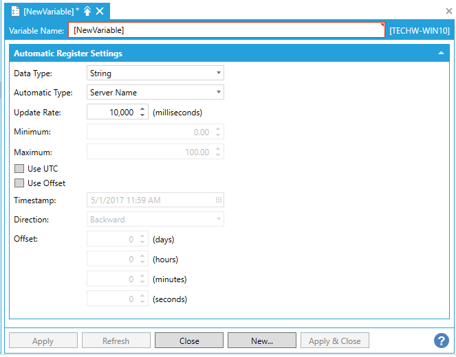 Data Type - Use the pulldown menu to select from Boolean, Byte, Char, Double, DWord, Float, Integer, DateTime, Short, String, or Word. Some of the following settings will be inactive based on your selection.