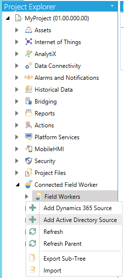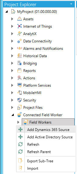 Right-click on the Field Workers branch, then select Add Dynamics 365 Source from the pulldown menu, as shown below.