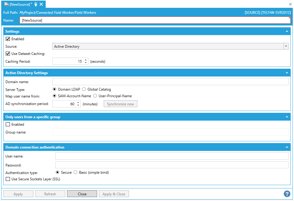 This opens the Field Workers - Active Directory Source configuration window, as shown below, within the Workbench. Enter a name for this configuration in the Name text entry field.