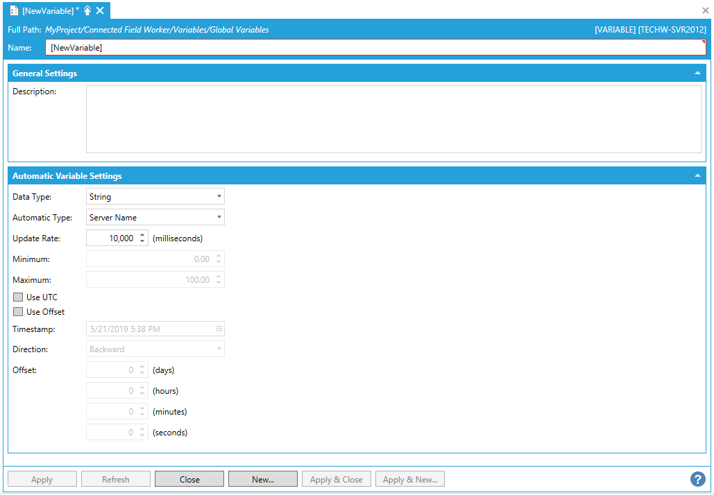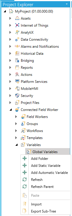Open the Workbench and expand your project, then the Connected Field Worker node, then the Variables node. Right-click on the Global Variables node. You will have the option of creating either a Static Variable or an Automatic Variable, as shown below. You could also choose to create a separate variable folder at this point.