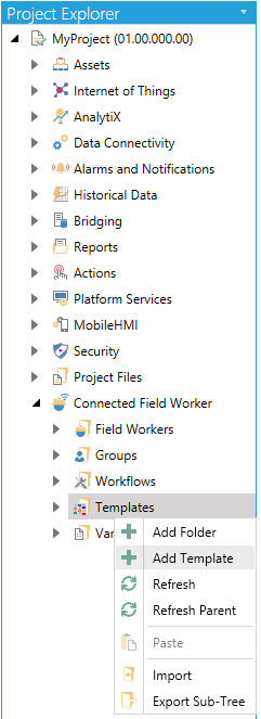 Right-click on the Templates branch or on a Template Folder, then select Add Template from the pulldown menu, as shown below.