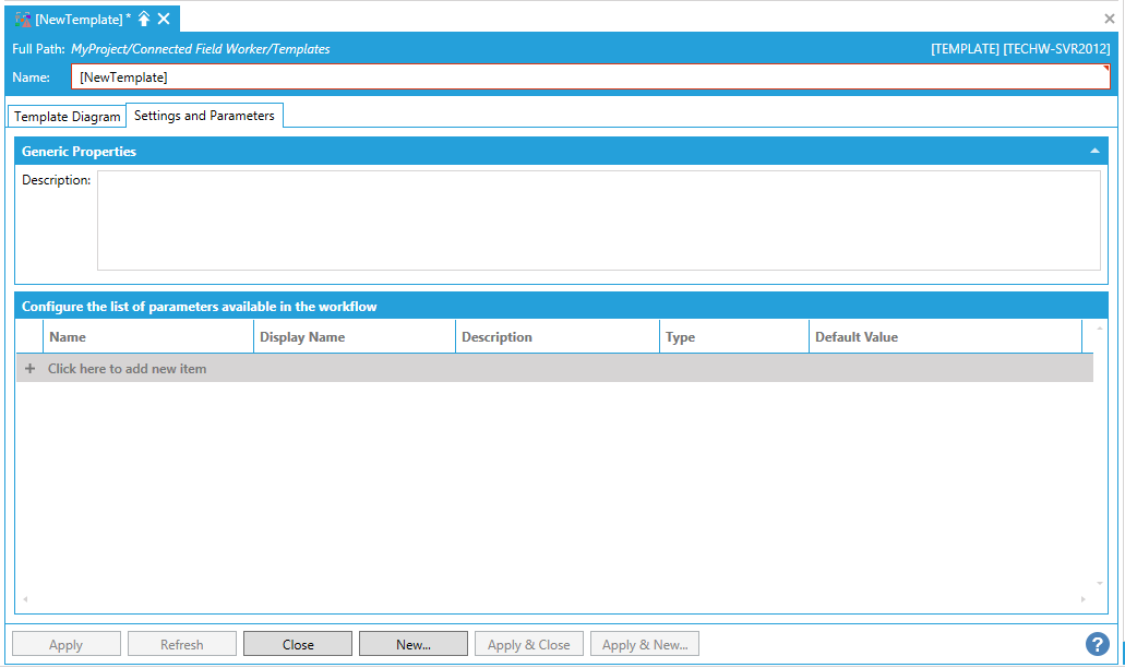 This opens the Template properties, as shown below, within the Workbench. Enter a name for this configuration in the Name text entry field.