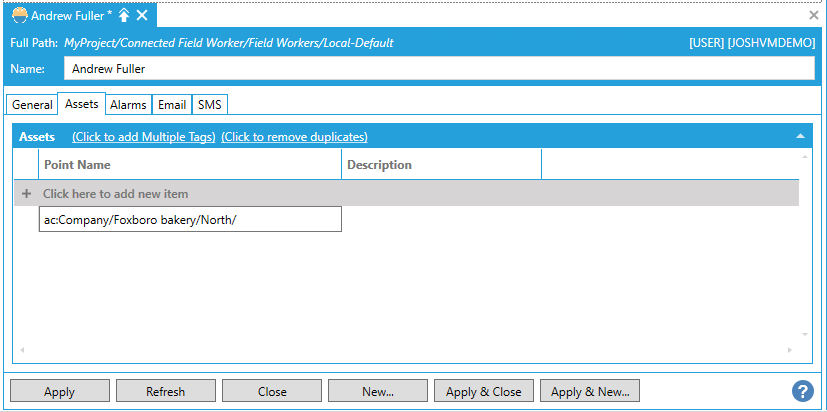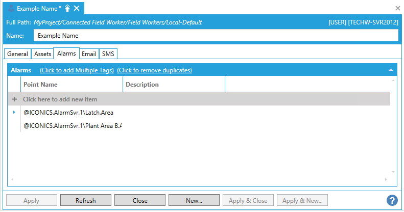 Click on the + Click here to add new item link to add an asset to the Alarms section of the User properties.