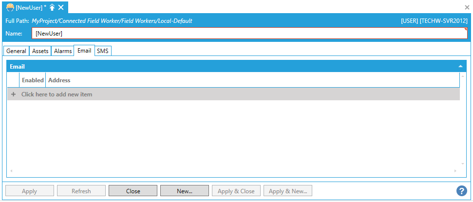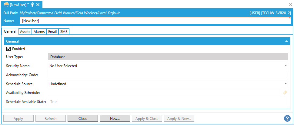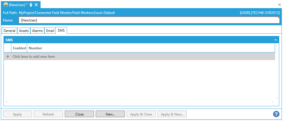 You can then set multiple properties for the new user including General, Assets, Alarms, Email, and SMS.