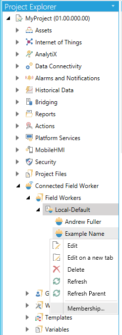 Expand your project in the Workbench, and then expand the Connected Field Worker node and then the Field Workers node and then the Local-Default source branch. Note: you can also view the group membership for Dynamics 365 or Active Directory users, but you can’t modify those memberships in CFSWorX. You must make such changes in Dynamics 365 or Active Directory.